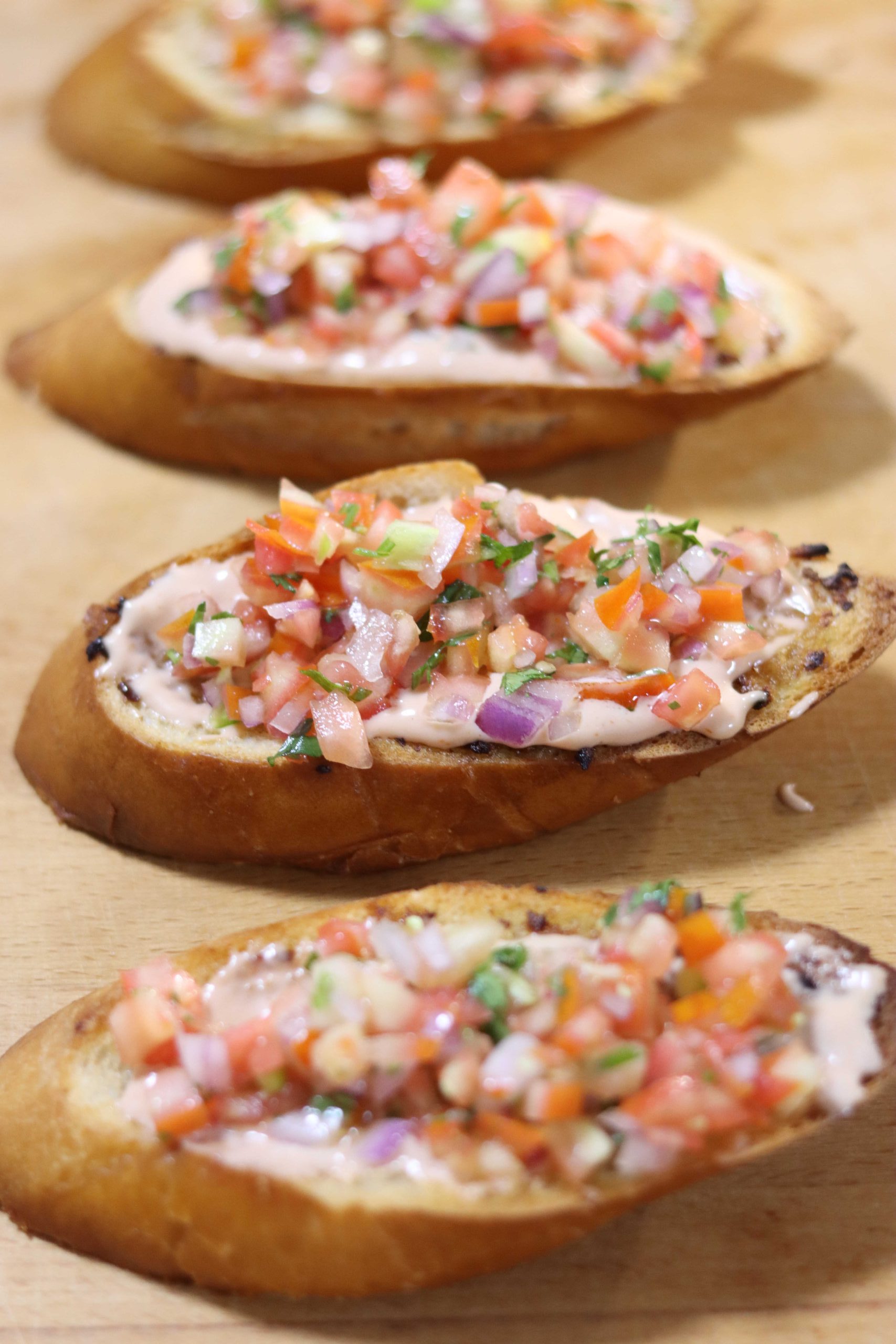 אפשר לחצות את הבגט לאורכו ואז לפרוס לריבועים אישיים, או מראש לפרוס אותו לפרוסות דקות. שתי הגרסאות עובדות נהדר, תלוי אם אתם רוצים מנה לאירוח או ביס אישי לנשנוש.