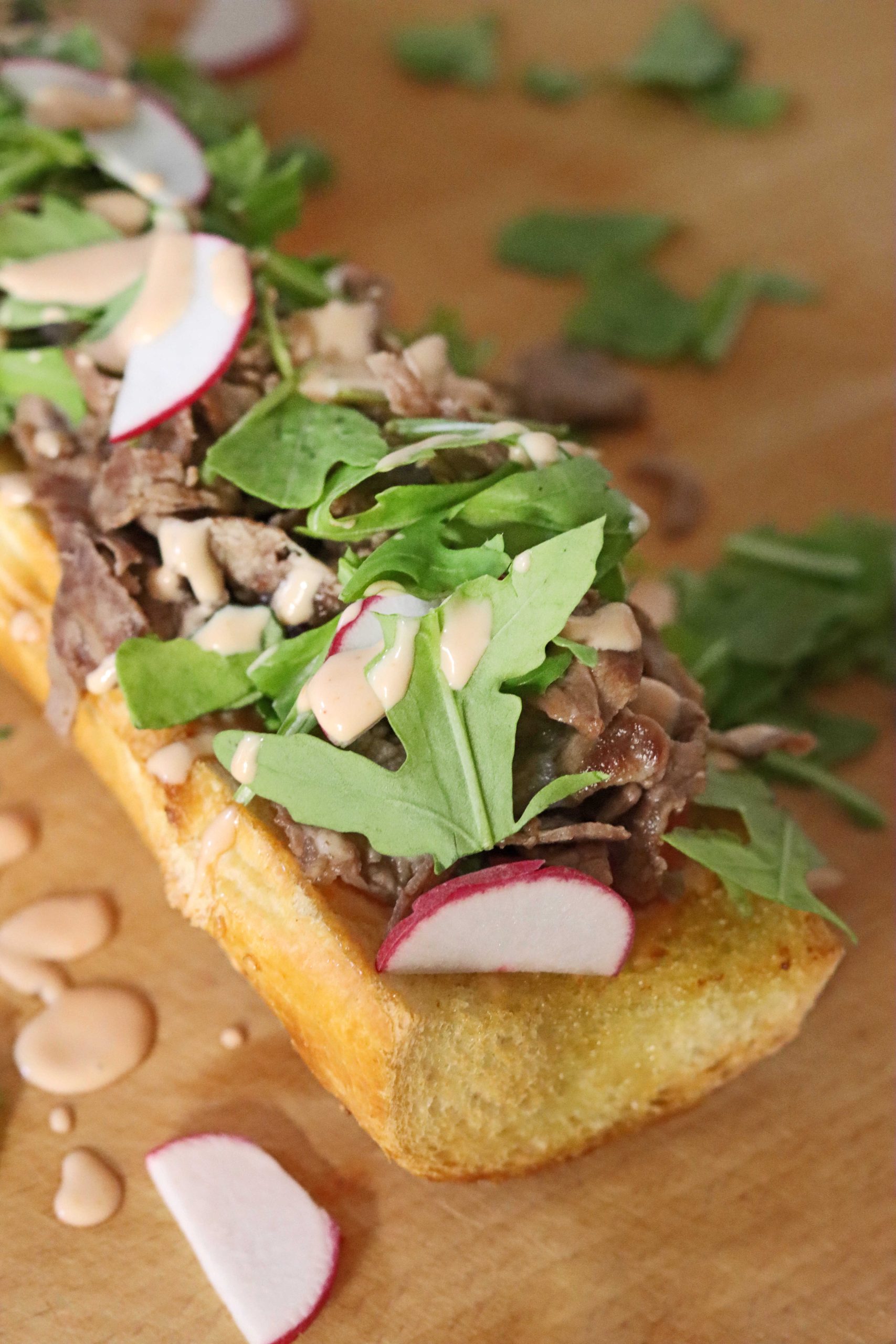 חוצים את הבגט לאורכו, מורחים בנדיבות ומכניסים לתנור שחומם מראש ל־180 מעלות, עד להשחמה קלה וקריספיות.