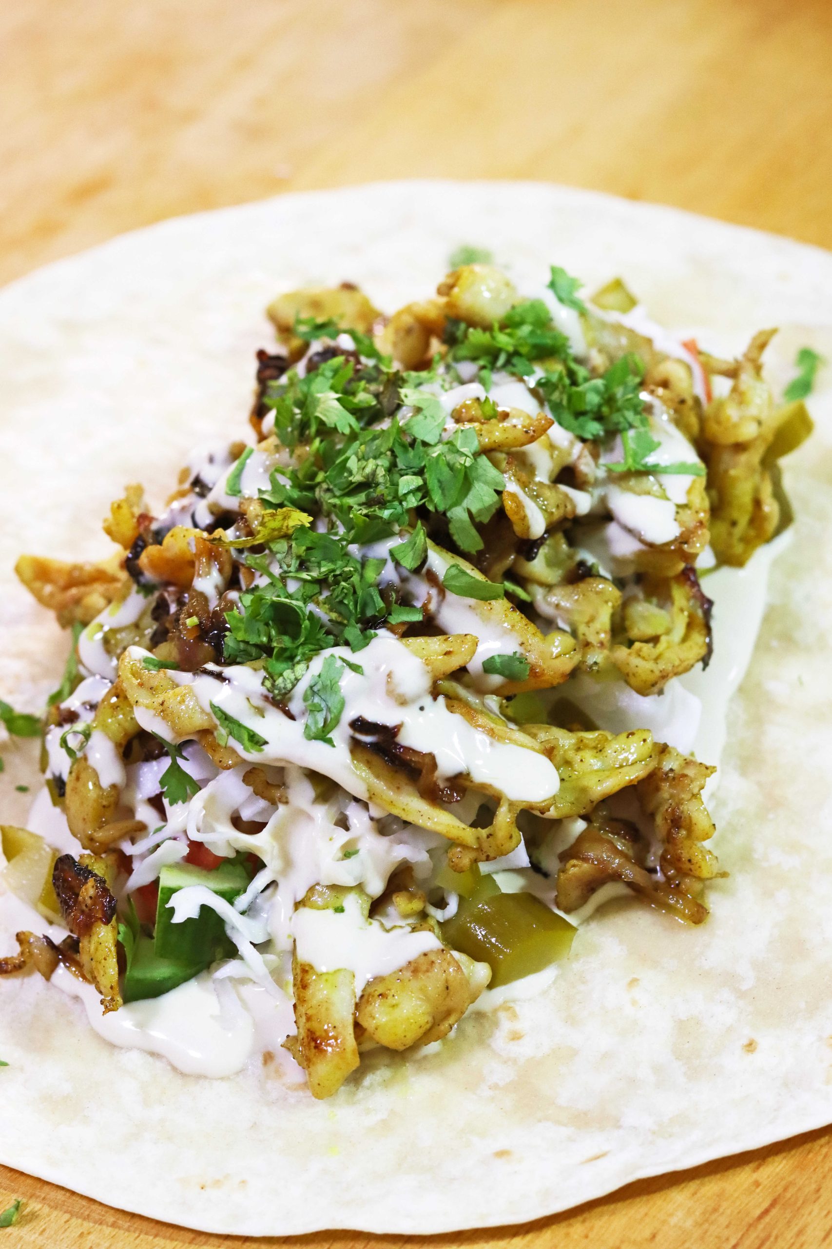 מורחים במרכז שכבת טחינה נדיבה, מניחים את הירקות, כרוב מוחמץ, ומעל – נתחי שווארמה פרגית עסיסיים עם הבצל המטוגן.